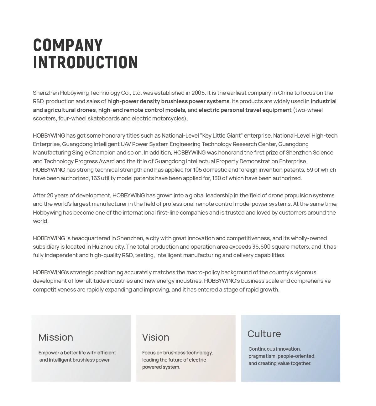 Prodotti principali: Sistema di spinta Drone, regolatore elettronico di velocità, motore Brushless, elica Drone, PCBA